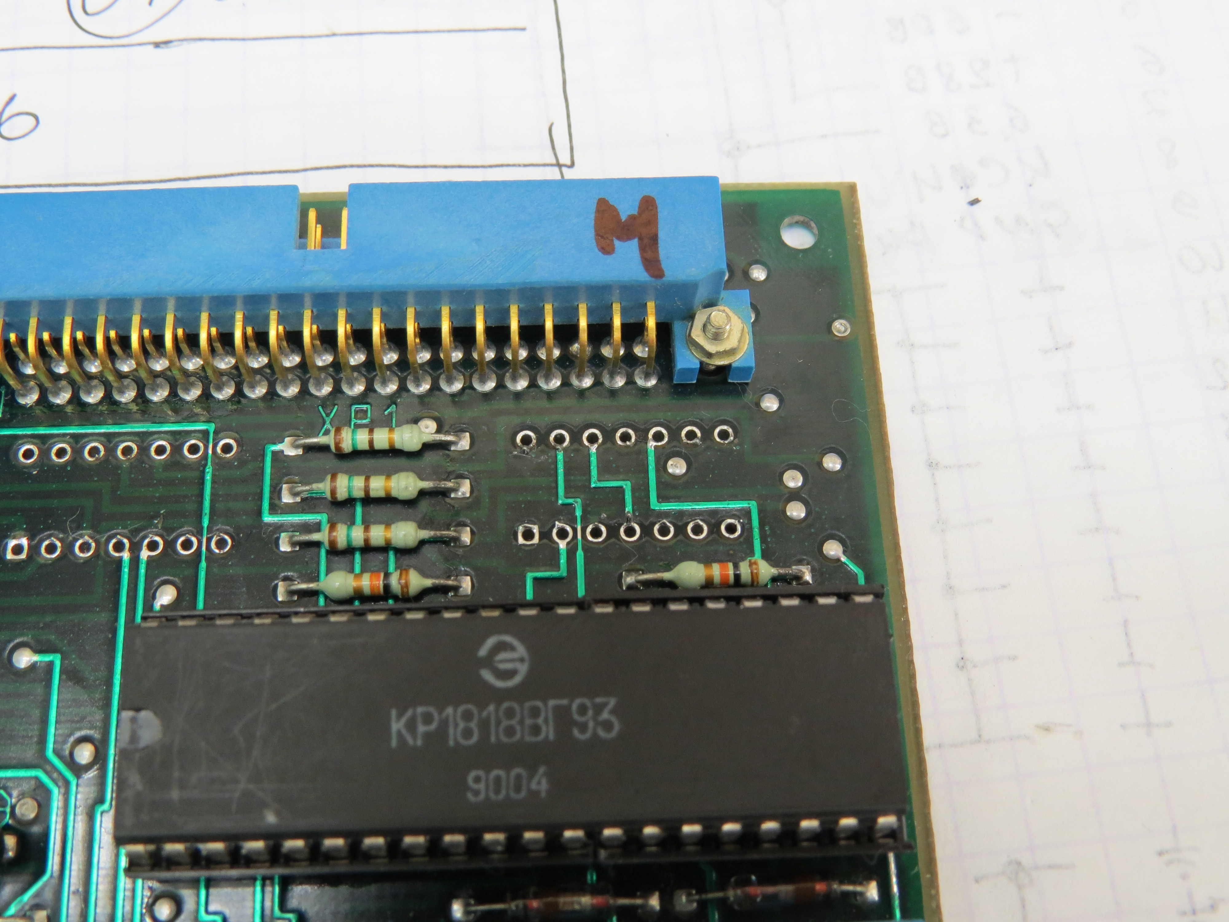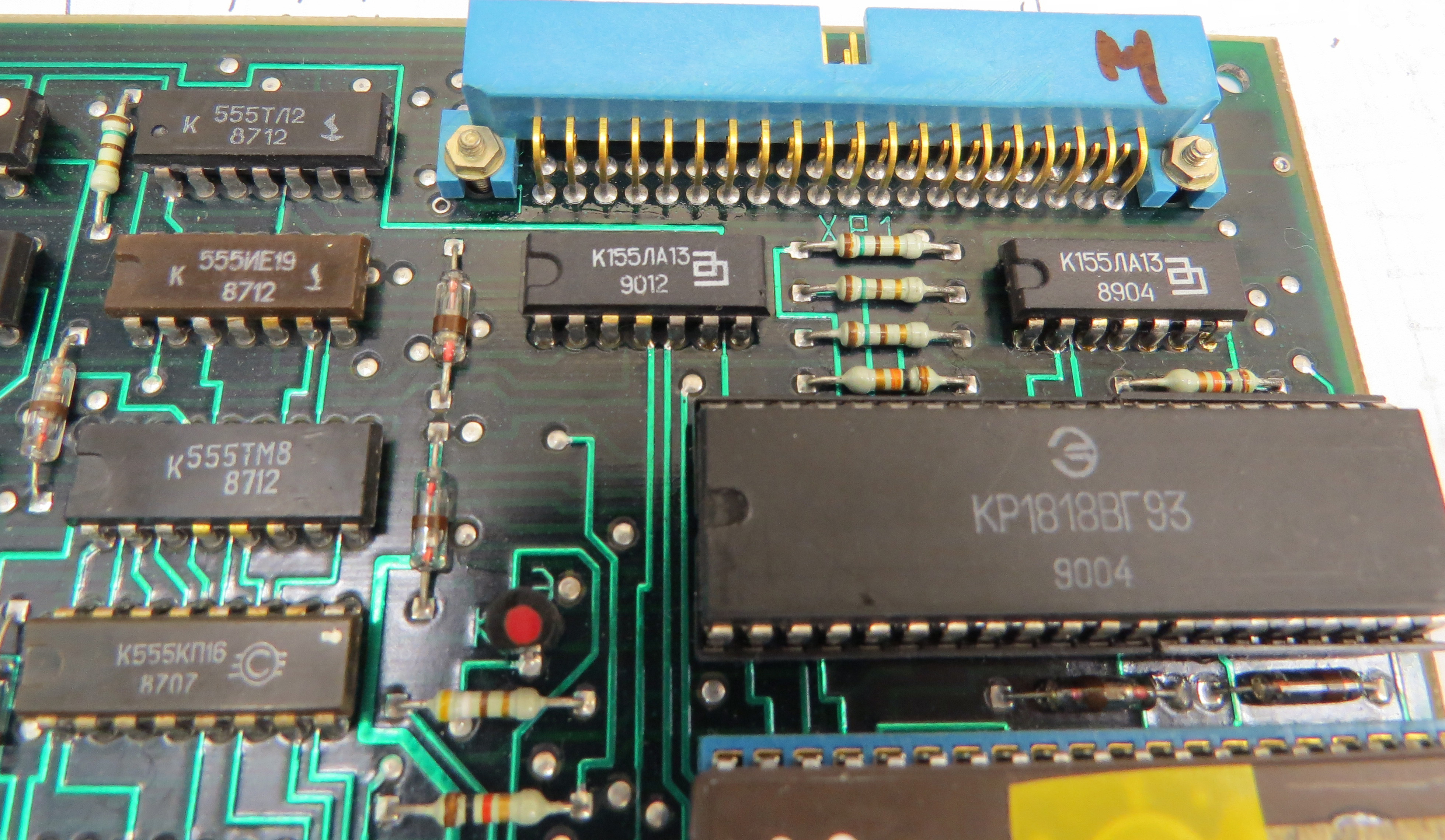 Адрес выборки из ПЗУ формируется счетчиками ИЕ7. Внимательно изучив входы ИЕ7, обнаруживаем соплю (те припойная перемычка которой быть не должно) на 1й ноге D53 которая садит сигнал на землю. Убираем ее, но пока этого мало. Изучив сигналы на входах и выходах приходим к выводу что ИЕ7 исправны, а паразитный сигнал идет через КП14 с D43
